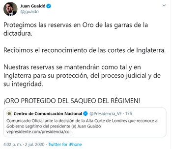 “Protegimos las reservas en oro de las garras de la dictadura. Nuestras reservas se mantendrán como tal y en Inglaterra para su protección, del proceso judicial y de su integridad. ¡Oro protegido del saqueo del régimen”, escribió en Twitter Guaidó, reconocido como presidente interino de Venezuela por casi 60 países.