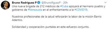 “Una nueva brigada de 212 médicos de #Cuba apoyará al hermano pueblo y gobierno de #Venezuela en el enfrentamiento a la #COVID19”, escribió este lunes el canciller cubano Bruno Rodríguez en cuenta de Twitter.