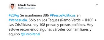 “Se mantienen 386 presos políticos en Venezuela. Sólo en Los Teques (Ramo Verde + INOF + Las Crisálidas), hay 108 presas y presos políticos. Hoy estuve recorriendo algunas cárceles con familiares y equipo”, manifestó Romero en su cuenta de Twitter.