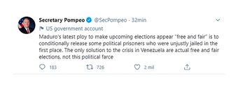 “La única solución a la crisis en Venezuela son elecciones libres y justas reales, no esta farsa política”, agregó en Twitter.
