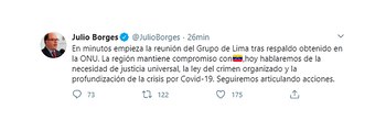 Por su parte, Julio Borges, Comisionado Presidencial para las Relaciones Exteriores del gobierno interino de Juan Guaidó, manifestó en Twitter: “La región mantiene su compromiso con Venezuela. Hoy hablaremos de la necesidad de justicia universal, la ley del crimen organizado y la profundización de la crisis por COVID-19. Seguiremos articulando acciones”.