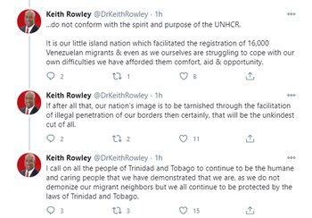Así comenzó su ola de mensajes en la red social. Y siguió su descargo: “Trinidad y Tobago se encuentra actualmente bajo el último asalto, utilizando personas sin nombre y sin rostro armadas con niños inocentes para tratar de obligarnos a aceptar su entendimiento de ‘la condición de refugiados y los tratados internacionales’, en el que se debe esperar que una pequeña nación insular de 1,3 millones de personas mantenga las fronteras abiertas con un vecino de 34 millones de personas incluso durante una pandemia”.