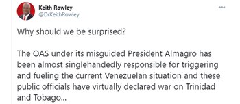 Sin embargo, Keith Rowley, primer ministro de Trinidad y Tobago, rompió este miércoles el silencio en Twitter para defender el accionar de su gobierno. “¿Por qué deberíamos sorprendernos?”, se preguntó. “La OEA, bajo el liderazgo equivocado de su presidente (Luis) Almagro, ha sido responsable casi por sí sola de desencadenar y alimentar la actual situación venezolana y estos funcionarios públicos prácticamente han declarado la guerra a Trinidad y Tobago por tener la temeridad de no haberse unido a Elliott Abrams y al presidente (Donald) Trump para forzar un violento cambio de régimen en Venezuela”.