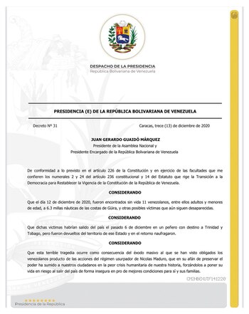 “Esta terrible tragedia ocurre como consecuencia del éxodo masivo al que se han visto obligados los venezolanos producto de las acciones del régimen usurpador de Nicolás Maduro, que en su afán de preservar el poder ha sumido a nuestros ciudadanos en la peor crisis humanitaria de nuestra historia, forzándolos a poner su vida en riesgo al salir del país de forma insegura en pro de mejores condiciones para sí y sus familiares”, señaló la presidencia interina.