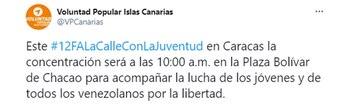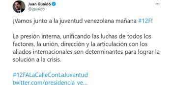 “¡Vamos junto a la juventud venezolana mañana (viernes) #12F! La presión interna, unificando las luchas de todos los factores, la unión, dirección y la articulación con los aliados internacionales son determinantes para lograr la solución a la crisis”, escribió Guaidó en su cuenta de Twitter.