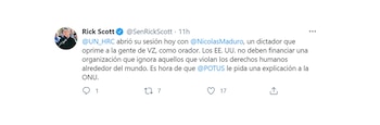 Scott, quien fue gobernador de Florida entre 2011 y 2019 y aliado político del ex presidente Donald Trump, subrayó que es tiempo para que el presidente estadounidense, el demócrata Joe Biden, y la embajadora de EEUU ante la ONU, Linda Thomas-Greenfield, hagan “rendir cuentas” a esta organización internacional.