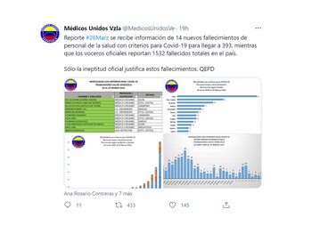 “Se recibe información de 14 nuevos fallecimientos de personal de la salud con criterios para COVID-19 para llegar a 393, mientras que los voceros oficiales reportan 1.532 fallecidos totales en el país. Solo la ineptitud oficial justifica estos fallecimientos”, dijo la ONG en su cuenta de Twitter.