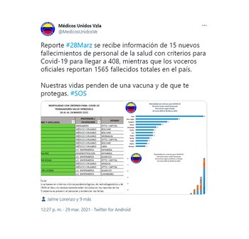 “Se recibe información de 15 nuevos fallecimientos de personal de la salud con criterios para COVID-19 para llegar a 408, mientras que los voceros oficiales reportan 1.565 fallecidos totales en el país. Nuestras vidas penden de una vacuna y de que te protejas”, dijo la ONG en un mensaje en Twitter.