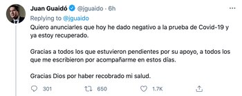 “Gracias a todos los que estuvieron pendientes por su apoyo, a todos los que me escribieron por acompañarme en estos días”, subrayó Guaidó a través de una publicación en su perfil de Twitter, donde también apeló a tomarse “en serio” la pandemia.