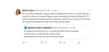 La ex azafata, sindicalista, diplomática y diputada mandato cumplido Alicia Castro señaló: “Es muy difícil entender cuál es nuestra política de medios, si existe alguna. Y cuál es la visión de nuestra Region que se pretende proyectar desde la TV pública argentina. Pareció que ya habíamos salido de la narrativa del Grupo de Lima. El nombramiento de Leo Flores, cuestionable”. Agregó un link a una nota de la Agencia Paco Urondo titulada “El pasado antichavista de Leonardo Flores: su polémica trayectoria en un canal de Miami: documentales antichavistas y operaciones contra Cuba”.