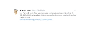 “Leo Flores: El periodista fue designado como nuevo director Ejecutivo de Televisión Pública. Pasado en Miami como directivo de un canal antichavista y anticastrista”: así comunicó la noticia el encuestador krichnerista, con link a un blog en el cual se señala que “el documental (Petare) recrea todos los lugares comunes de la derecha regional contra el Gobierno de Nicolás Maduro”.