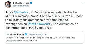En la misma sintonía, Delsa Solórzano, presidenta del Partido Encuentro Ciudadano y defensora de los derechos humanos, expresó: “Señor Alberto Fernández, en Venezuela se violan todos los DDHH al mismo tiempo. Por ello quien usurpa el Poder en mi país y sus cómplices hoy están siendo investigados en la Corte Penal Internacional. Son criminales de lesa humanidad. ¡Qué vergüenza!”.