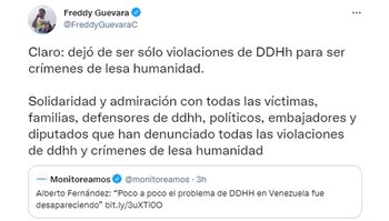 Otro opositor que alzó la voz fue el diputado Freddy Guevara. “Claro: dejó de ser sólo violaciones de DDHH para ser crímenes de lesa humanidad. Solidaridad y admiración con todas las víctimas, familias, defensores de DDHH, políticos, embajadores y diputados que han denunciado todas las violaciones de DDHH y crímenes de lesa humanidad”, manifestó también en Twitter.