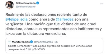 Y siguió: “Realmente las declaraciones recientes tanto de Felipe Solá (canciller argentino), como ahora de Alberto Fernández son una vergüenza. Una nación que fue víctima de una cruel dictadura, ahora sus representantes son indiferentes y laxos con la dictadura venezolana”.