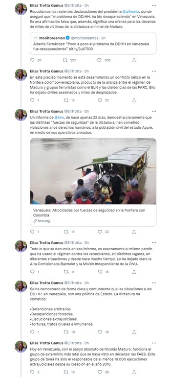 Por último, Elisa Trotta Gamus, representante de la Asamblea Nacional de Venezuela en la Argentina designada por el presidente encargado Juan Guaidó, publicó una serie de tuits: “Repudiamos las recientes declaraciones del presidente Alberto Fernández, donde aseguró que ‘el problema de DDHH ha ido desapareciendo’ en Venezuela. Es una afirmación falsa que, además, significa una ofensa para las decenas de miles de víctimas de la dictadura criminal de Maduro”.