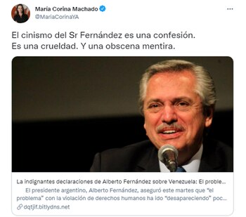 Una de las primeras en alzar su voz en Twitter fue la política opositora venezolana María Corina Machado. “El cinismo del Señor Fernández es una confesión. Es una crueldad. Y una obscena mentira”, manifestó en su cuenta en la red social.