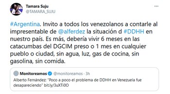 Por su parte, Tamara Suju, abogada defensora de Derechos Humanos, Directora Ejecutiva del Casla Institute y Delegada ante la Corte Penal Internacional, subrayó: “Invito a todos los venezolanos a contarle al impresentable de Alberto Fernández la situación de DDHH en nuestro país”.