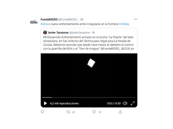 “Enfrentamiento armado en la trocha La Playita del lado venezolano, en San Antonio del Táchira, paso ilegal para La Parada de Cúcuta. Debemos recordar que desde hace meses se debaten el control con la guerrilla del ELN y el Tren de Aragua”, escribió en Twitter el director de Fundaredes, Javier Tarazona.