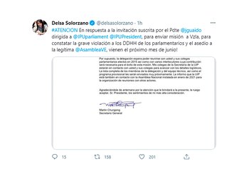 “En respuesta a la invitación suscrita por el Presidente Juan Guadió dirigida a @IPUparliament @IPUPresident, para enviar una misión a Venezuela para constatar la grave violación a los DDHH de los parlamentarios y el asedio a la legítima Asamblea Nacional. Vienen en junio”, expresó la política en la red social.