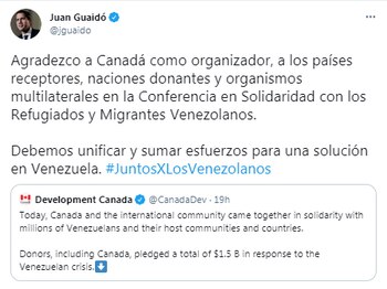 “Agradezco a Canadá como organizador, a los países receptores, naciones donantes y organismos multilaterales en la Conferencia en Solidaridad con los Refugiados y Migrantes Venezolanos. Debemos unificar y sumar esfuerzos para una solución en Venezuela”, dijo Guaidó en un mensaje en Twitter.