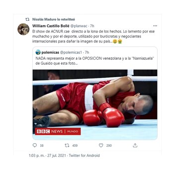 “El show de ACNUR cae directo a la lona de los hechos. Lo lamento por ese muchacho y por el deporte, utilizado por burócratas y negociantes internacionales para dañar la imagen de su país”, escribió el viceministro de Políticas Antibloqueo del régimen, William Castillo, en una respuesta en Twitter a otra publicación que incluye una imagen de Sella derrotado en Tokio y el mensaje “NADA representa mejor a la OPOSICIÓN venezolana y a la ‘Narniazuela’ de Guaidó que esta foto...”. Además, este posteo de Castillo fue retuiteado por Nicolás Maduro.