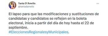 “El lapso para que las modificaciones y sustituciones de candidatas y candidatos se reflejen en la boleta electoral inicia a partir del día de hoy hasta el 22 de septiembre”, escribió la rectora del ente Tania D’Amelio en su cuenta en Twitter.