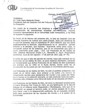 La Confederación de Asociaciones Israelitas de Venezuela (CAIV), la Unión Israelita de Caracas y la Asociación Israelita de Venezuela denunciaron a Yván Darío Bastardo, presidente de la Sala de Casación Civil del Tribunal Supremo de Justicia del régimen venezolano, por citar en una sentencia el texto antisemita Los Protocolos de los Sabios de Sión.