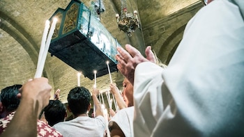 Para los gitanos, los momentos más importantes de esta celebración son después de comer. Entonces llega la ceremonia del descenso del arcón que guarda las cenizas de las santas. Sacan a Santa Sara de la cripta y sobre ella se amontonan decenas de personas para tocarla y besarla.