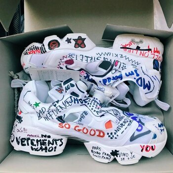 Varios diseñadores han presentado recientemente versiones de zapatillas pre-ensuciadas. La colaboración en la temporada otoño/invierno '15 de Raf Simons y Adidas incluía Stan Smiths reinventadas con la suela llena de arañazos oscuros y el empeine de cuero. El desfile de Hedi Slimane en la temporada primavera/verano '16 para Saint Laurent mostró un discreto par de zapatillas desgastadas como parte de su remodelación de la histórica casa francesa. Y para una de sus muchas colaboraciones, Vetements se alió con Reebok para crear la zapatilla sin cordones InstaPump Fury para la temporada primavera/verano '17: una zapatilla de cuero blanco cubierta de grafitis y garabatos que recordaba a las paredes del baño del garito al que sueles ir a beber.