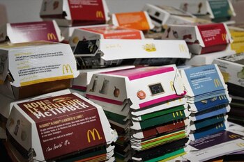 "McDonald's cambia sus diseños cada 10 años. En los 90, una década con demasiada comida rápida, había cajas de poliestireno con muchas letras M. Luego cuando la gente comenzó a decir que era comida chatarra, McDonald's diseñó las cajas de cartón, más amables con el ambiente y deseables. El nuevo estilo es una purificación 'ecológica' total para ellos, hoy en día es el único estilo".