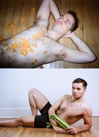 Al día siguiente se tomó la foto del antes con la fotógrafa y directora Nicole Bazuin. Bazuin, aburrida de las típicas fotos de ejercicio, sugirió que tuviéramos un tema para la serie. Nos decidimos por la comida en paquetes. A lo largo de dos horas estuve echándome doritos por todo el cuerpo. Saqué panza y la bañé en refresco de naranja. Nos decidimos por la iluminación menos favorecedora y los peores ángulos.