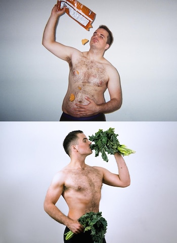 Al día siguiente fue la sesión de fotos del después. Nicole, nuestra fotógrafa, se esmeró para que saliera muy bien. Para contrastar el tema de los nachos de la sesión de fotos inicial, compramos muchas hortalizas para posar en esta. Antes de prepararlo todo, el técnico de iluminación se tragó una hamburguesa y un Kit Kat extragrande. Con el aroma de la comida rápida en el aire, me puse a hacer flexiones e intenté centrarme en el consejo de Geoff. Para bien o para mal, el proyecto terminaría en una hora. Finalmente, después de un rato, la sesión estaba lista para empezar. En ropa interior, flexioné los músculos y la cámara disparó. Vi las tomas. No está mal. Me sentí bien.