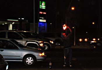 Guadalupe: Mi hermano había trabajado en un circo y sabía cómo hacerlo. A veces lo acompañaba a los semáforos y miraba como él y otros batos del barrio lo hacían. Como no terminé la secundaria y me daban trabajos muy mal pagados y cansados, una tarde le dije a mi hermano que me ayudara. Me prendió la antorcha, le di un trago a un bote con diesel y lo escupí; se hizo el fuego frente a los autos. Desde ese día no he parado de hacerlo.
