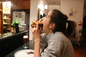 Quizá necesitaba un poco de apoyo moral. Así que arrastré a mi novio a comer hamburguesas conmigo, preparadas con vegetales y grillos. y aunque las hamburguesas estaban descuidadas, verlo comer un cuarto de libra de grillos me hizo sentir segura. Logré comer la mitad de la hamburguesa antes de sentirse enfermo. Y entonces a mí también me dio asco.