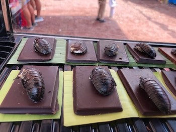 Ya envalentonado, me dispongo a recorrer otras carpas y es así como llego a la Chocolatería Época de Oro, donde el producto estrella es precisamente lo que me atrajo a este lugar: un exótico postre que consiste en una cucaracha garapiñada servida sobre una tableta de chocolate. Ahí es Erick Gallardo quien me explica porqué la cucaracha se ha convertido en la joya de la corona del negocio: "es un producto muy novedoso. Yo la probé en un viaje, esta no es la cucaracha que te encuentras en la cocina, sino una variedad que viene de Madagascar. Actualmente tengo un criadero y puedo decirte que son muy limpias y son totalmente aptas para el consumo humano".