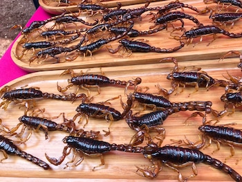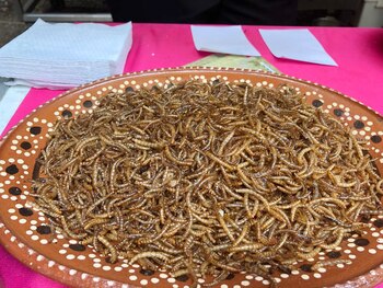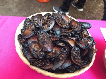 "Todos nuestros productos son frescos y no ponen en peligro de extinción a las especies, como algunos piensan. La tarántula, por ejemplo, es una especie originaria de Veracruz, pero esta se cría especialmente para consumo humano. Esta variedad es la araña de cola rosada, que es bastante grande y por lo mismo es muy atractiva a la vista", me explica Edith, quien es la responsable de este stand. Pero no es la tarántula la que me provoca escalofrío, sino un recipiente repleto de cucarachas, a las que veo panza arriba como aquella vez en que una de sus primas intentó meterse por mi boca hace más de 20 años. Parece que soy muy transparente en mis gestos, porque se apura a explicarme: "estas cucarachas vienen de un criadero que está en la Universidad de Chapingo. Tienen una dieta a base de avena y charales; realmente son muy limpias y están muy bien alimentadas. Yo me atrevería a decir que comen mejor que muchas personas", me dice entre risas.
