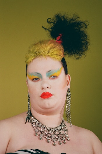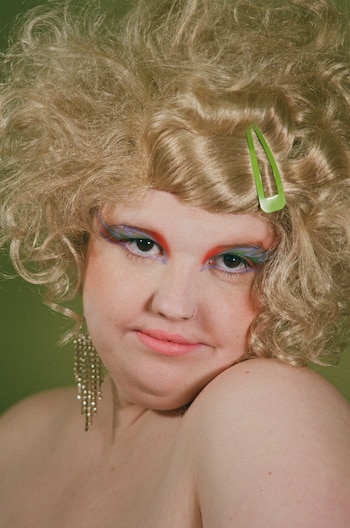 Al contrario, estas imágenes celebran la papada con looks de maquillaje extravagantes, sacando referencias del estilo de los 80 y canalizando una estética de Dynasty . "Quiero ver a las mujeres gordas exageradas, ridículamente glamorosas, con contornos deportivos, arrugas en los ojos y goteando diamantes", dice Gamble con entusiasmo.
