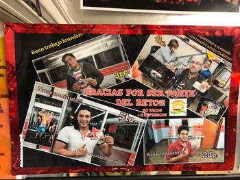 Mientras una mesa se desocupaba, me puse a husmear en las paredes. Una de ellas, el Muro del Honor, ostentaba las fotografías de todos los que hasta la fecha han logrado cumplir el reto. Cuando al fin nos hicimos de un lugarcito, el chico que nos atendió me dijo cuántas personas habían logrado el reto de los 50 tacos: 17. Así me enteré también que llevaban ya dos años haciendo este reto, aunque la taquería tiene 13 de haber abierto sus puertas.