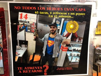 "El reto básico consiste en acabarse 50 tacos +1 y dos refrescos en menos de una hora y con eso no sólo no pagas los tacos que te comiste, sino que además te premiamos con 600 pesos. Pero también tenemos el reto Máximo Glotón, que es romper el récord actual, impuesto por un cliente nuestro. Él se comió 64 tacos, 4 refrescos y un postre en 44 minutos. Si alguien logra comerse ese número de tacos +1 en una hora, el ganador se hace acreedor a un premio de 2,000 pesos y un taco trofeo. Pero si de plano se los termina antes de 44 minutos, que fue el tiempo que él hizo, entonces el premio es de 2,500 pesos, el taco trofeo, y lo coronamos como el nuevo Máximo Glotón".