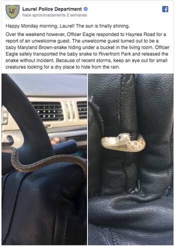 En Laurel (Maryland), el departamento de policía ha publicado varias fotografías de sus encuentros con estos reptiles. Uno de sus oficiales ayudó a una familia tras encontrar una serpiente cerca de su casa.