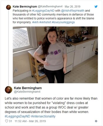 Un grupo de estudiantes, Irish 4 Reproductive Health, declaró de manera similar el martes que sería "Leggings Pride Day". En Facebook, el grupo explicó que la carta de White, aunque bien intencionada, "perpetúa una narrativa central de la cultura de la violación" al insinuar que la elección de ropa de las mujeres es la culpable de la conducta inapropiada de los hombres. Se invitó a personas de todos los géneros a "tomar una decisión consciente para usar leggings y así afirmar su derecho y capacidad para hacerlo", luego publicar fotos en las redes sociales.