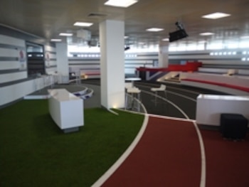 For entertainment purposes, a large reception wall was created with a miniature athletics track.