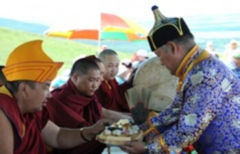 Buddhist monks from Chita were on hand to bless the torch during its relay. Various Lamas from a temple in Chita presided over the torch relay while givingblue khadacks - long silk scarves - as gifts to the relay participants. The scarfs are symbols ofhospitality, sky, and longevity.