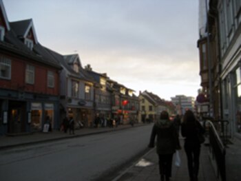 The bid has two names: Tromso 2018 and Romsa 2018, which is the city's name in the language of its indigenous people, the Sami. At first glance, its logo looks like a stick figure on a ski, modeled after Stone Age rock carvings, but it also resembles the Arctic Cathedral, Tromso's most famous landmark. Tromso's main street, Storgata. (ATR)
