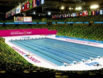 Swimming events began March 25 in the Rod Laver Arena. Better known as the venue for the Australian Open tennis match, the arena has been turned into a temporary swimming pool. Spectator capacity is 11,700.