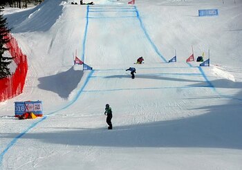 Similar to individual ski or snowboard cross, competitors raced side-by-side, jostling and maneuvering against one another, navigating rollers, banked curves, jumps and other tough terrain features. When a racer crosses the finish line, the starting gate up top is expected to open automatically for the next teammate.