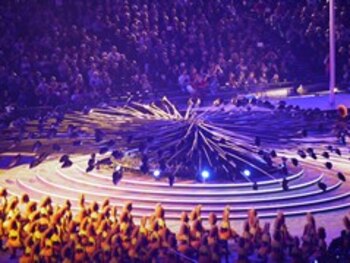 Just as its formation was a surprise, it went out with a blaze of glory, sinking down to a semicircle shape as fireworks went off behind it and a phoenix appeared and Take That performed.