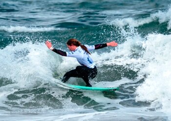 Seventy-seven female surfers took to the waves on Saturday as competition got underway on a beautiful, sunny, albeit breezy day.
