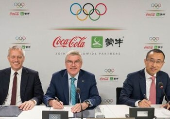 Just minutes before the start of the IOC Session on Monday, Thomas Bach was flanked by James Quincey, CEO of the longest Olympic Sponsor Coca-Cola and Jeffrey Lu, CEO of Mengniu the newest member of the Olympics. Coca-Cola was in Lausanne to announce they’ve extended their IOC partnership until 2032, doing so with Chinese dairy giant Mengniu.