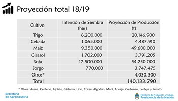 El informe calcula más de 54,2 millones de toneladas de soja, con una intensión de siembra de 17,5 millones de hectáreas, y casi 50 millones de toneladas para maíz (9,3 millones de hectáreas). Además, estiman 20,1 millones para trigo, con una intención de siembra de más de seis millones de hectáreas, y por último, casi cuatro millones de toneladas de girasol con 1,7 millones de hectáreas de intención de siembra. Además, contempla otros productos como cebada, sorgo, avena, alpiste, lino, algodón, maní, arvejas, lenteja, poroto, etc.